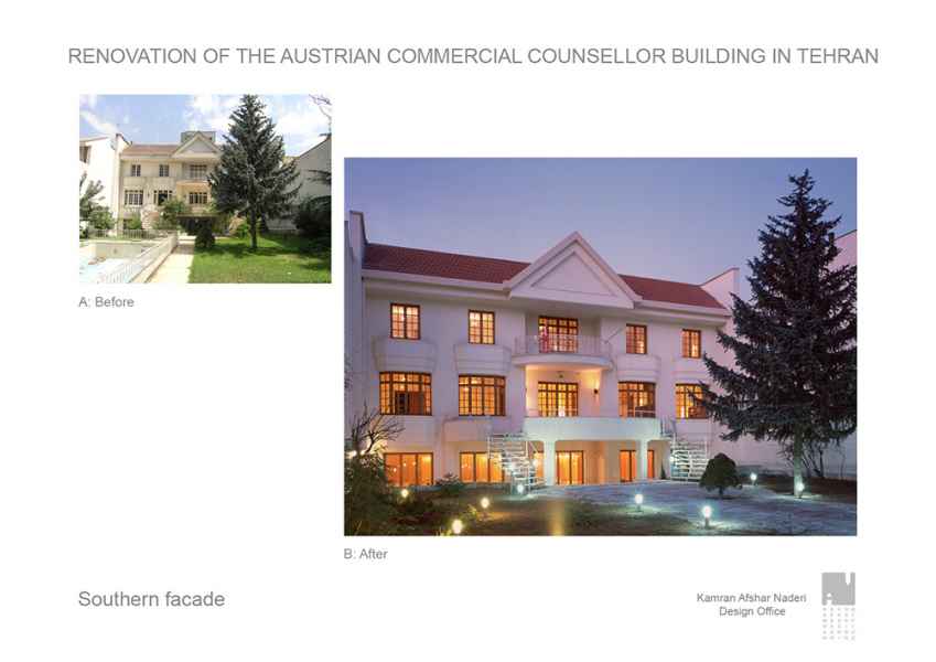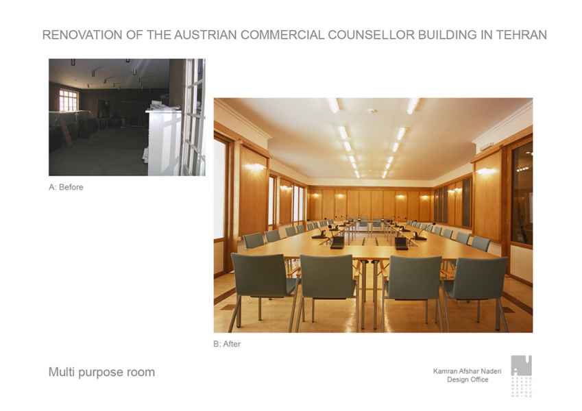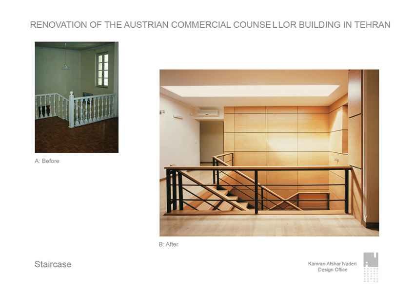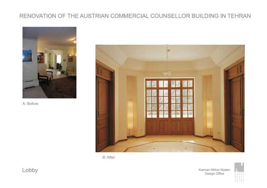 In 2004 the Commercial counselor of the Austrian Embassy, entrusted us, the reinforcement and refurbishment of its office in Jordan neighborhood. I was in charge of both design and construction. The plot was 880 m2 large and the built area around 1000 m2. The real challenge in this project was how to reinforce the structures with 60 tons of steel profiles and to replace all the technical installations and finishes without interrupting even a day the office routine functions. In order to get over this problems, the project team, divided the building vertically into 2 parts. Once the first part was finished, the office moved in and the construction works started at the second part. The works included reinforcement of the structures against earthquake, replacement of the mechanical, electrical and plumbing systems, reconstruction of the terrace, transforming the underground floor into a multifunctional meeting room with a plenty of natural light, creation of a new staircase, creation of sky lights, full refurbishment of the toilets and kitchen, restoration of the old doors and windows (originally designated to be replaced by PVC openings), furniture, landscaping etc.