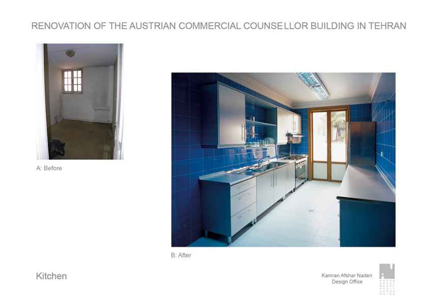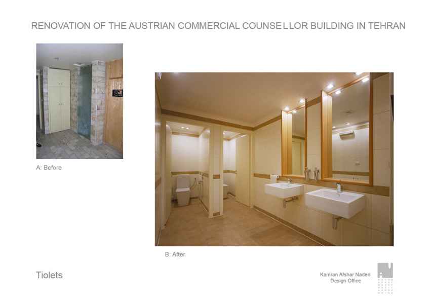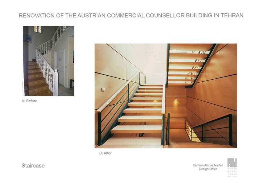 In 2004 the Commercial counselor of the Austrian Embassy, entrusted us, the reinforcement and refurbishment of its office in Jordan neighborhood. I was in charge of both design and construction. The plot was 880 m2 large and the built area around 1000 m2. The real challenge in this project was how to reinforce the structures with 60 tons of steel profiles and to replace all the technical installations and finishes without interrupting even a day the office routine functions. In order to get over this problems, the project team, divided the building vertically into 2 parts. Once the first part was finished, the office moved in and the construction works started at the second part. The works included reinforcement of the structures against earthquake, replacement of the mechanical, electrical and plumbing systems, reconstruction of the terrace, transforming the underground floor into a multifunctional meeting room with a plenty of natural light, creation of a new staircase, creation of sky lights, full refurbishment of the toilets and kitchen, restoration of the old doors and windows (originally designated to be replaced by PVC openings), furniture, landscaping etc.